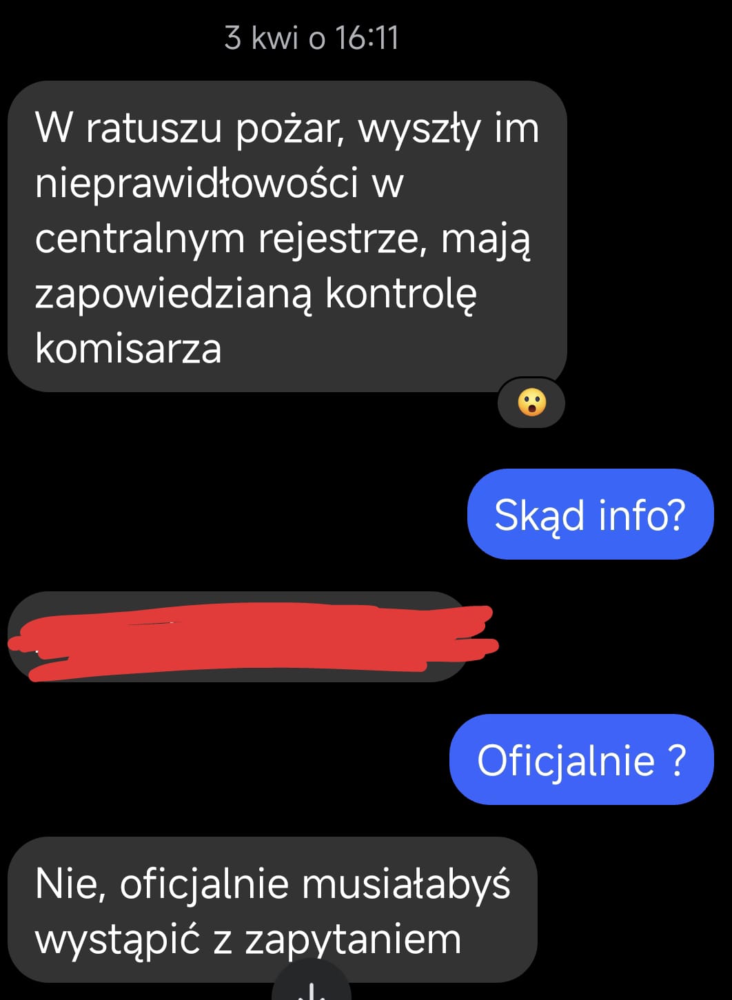 Co ciekawe, sygnały o tym, że w urzędzie dzieje się coś dziwnego, dotarły do nas już 3 kwietnia w godzinach popołudniowych. Na naszą skrzynkę wpłynęła wtedy niepokojąca informacja od anonimowego źródła: „W ratuszu pożar, wyszły im nieprawidłowości w centralnym rejestrze, mają mieć zapowiedzianą kontrolę komisarza”.