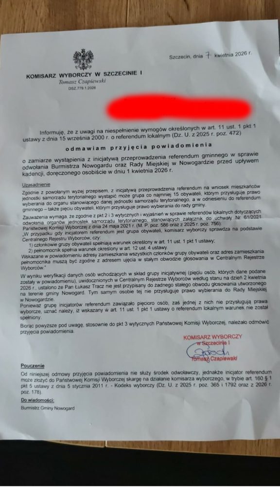 Podsumowując: Wniosek odrzucony z powodu „braku wyborcy”, który dwa dni wcześniej był wyborcą. Brzmi jak marny żart na Prima Aprilis, ale niestety to nasza, nowogardzka rzeczywistość.