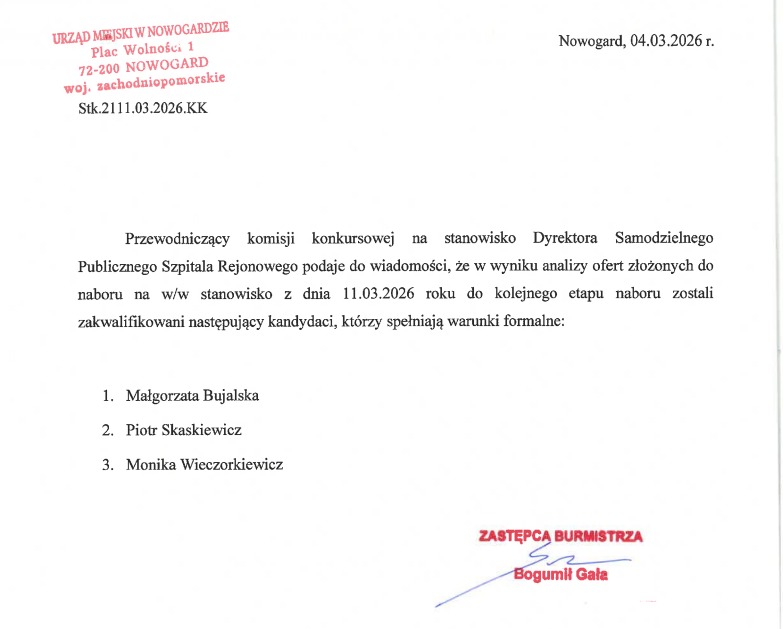 Jakby tego było mało, wiceburmistrz Bogumił Gała w sprawie konkursu na dyrektora szpitala udowodnił, że potrafi zagiąć czasoprzestrzeń jak nikt inny. Ogłoszenie o naborze na stanowisko dyrektora szpitala w Nowogardzie ukazało się 11 marca, kandydatury „zbierano” do 23 marca, a Pan wiceburmistrz już 4 marca podpisał oświadczenie o wyłonieniu trójki kandydatów do drugiej tury.