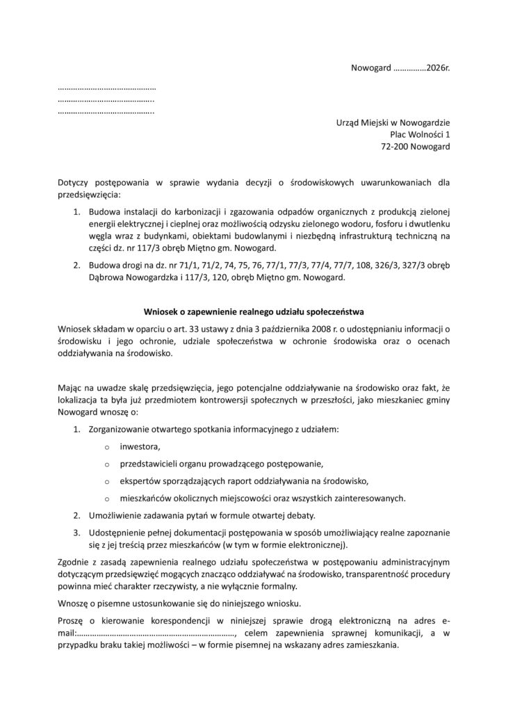 W związku z tym został przygotowany wniosek o zapewnienie realnego udziału społeczeństwa w postępowaniu. Dotyczy on organizacji otwartego spotkania z udziałem inwestora, organu prowadzącego oraz autorów raportu.